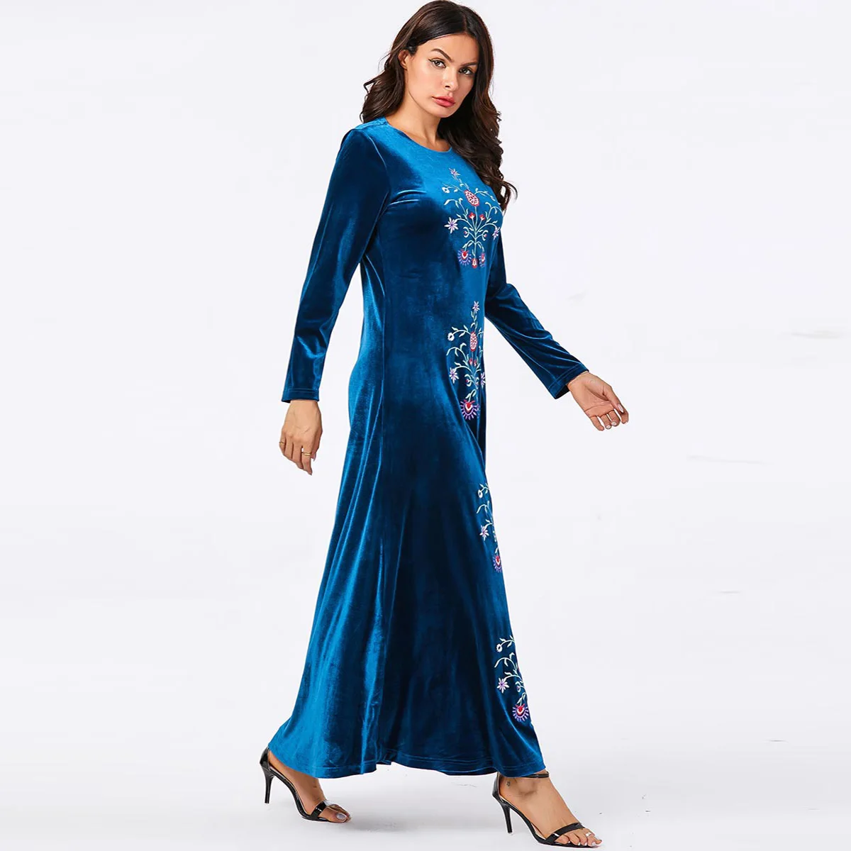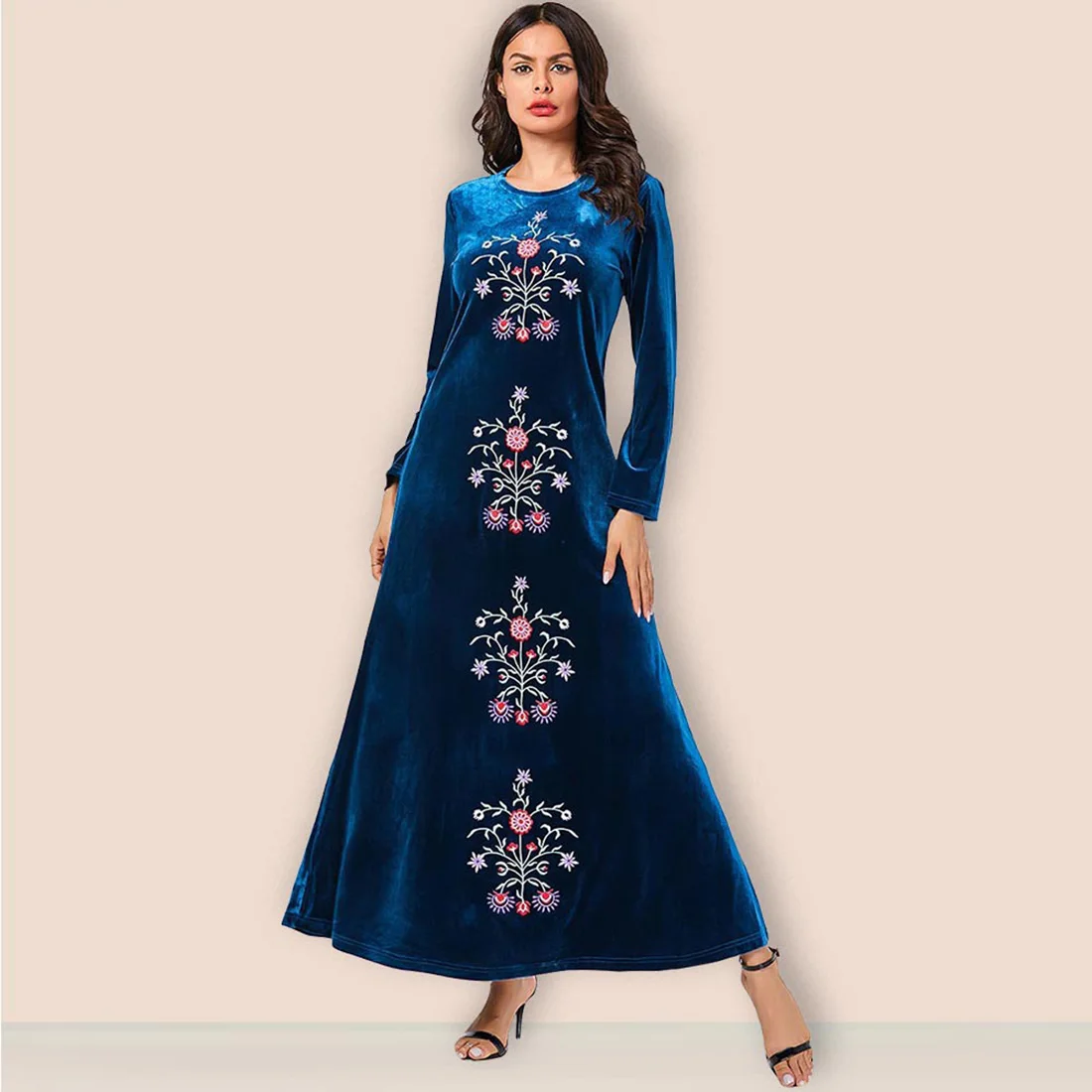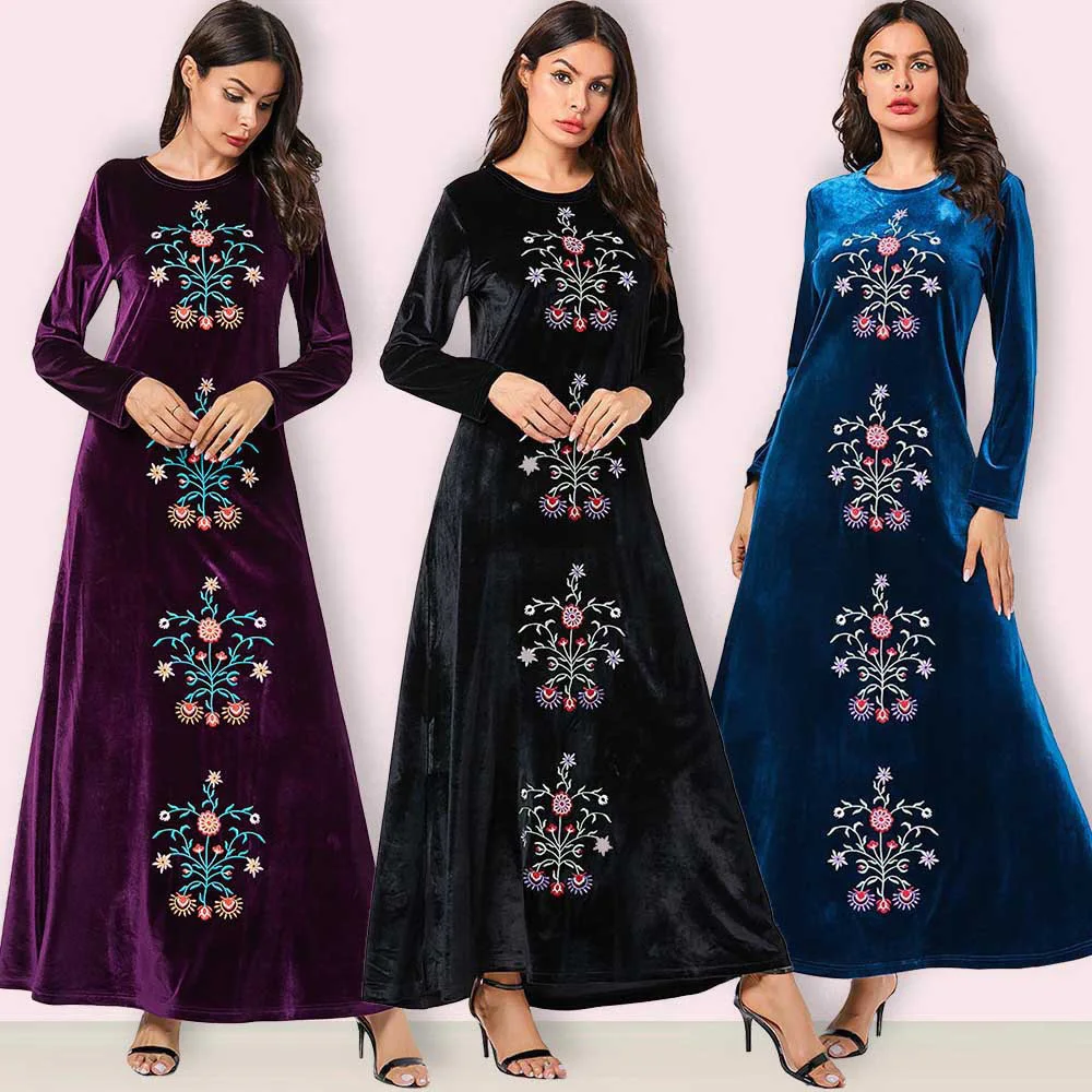 Fashion Large Women’s Blue Plant Embroidered Round Neck Muslim Casual Gold Velvet Large Dress