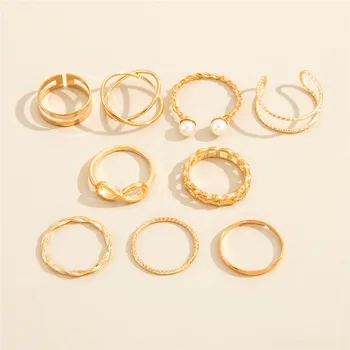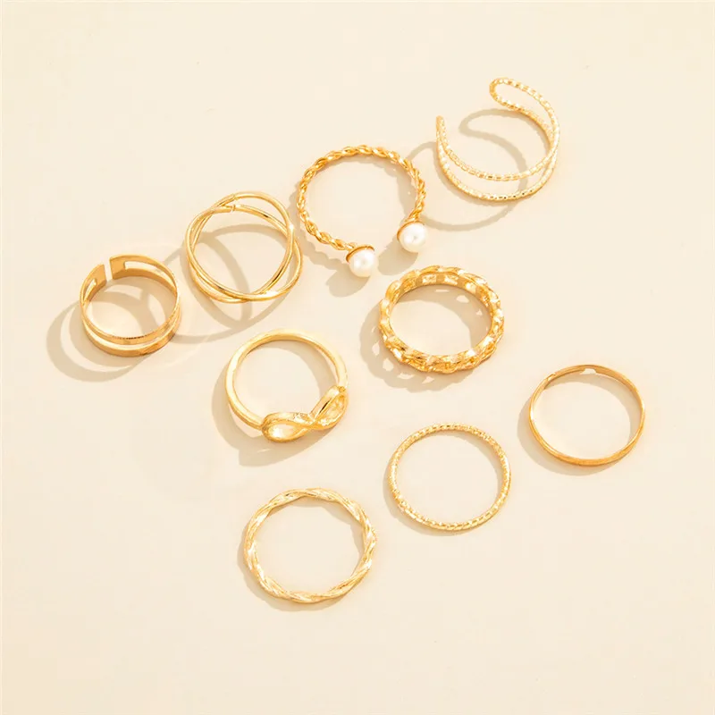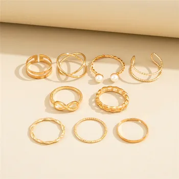 9pcs Punk Gold Color Chain Rings Set For Women Girls Fashion Irregular Finger Thin Rings