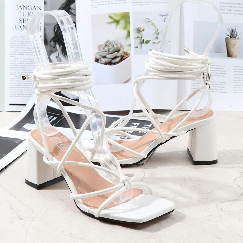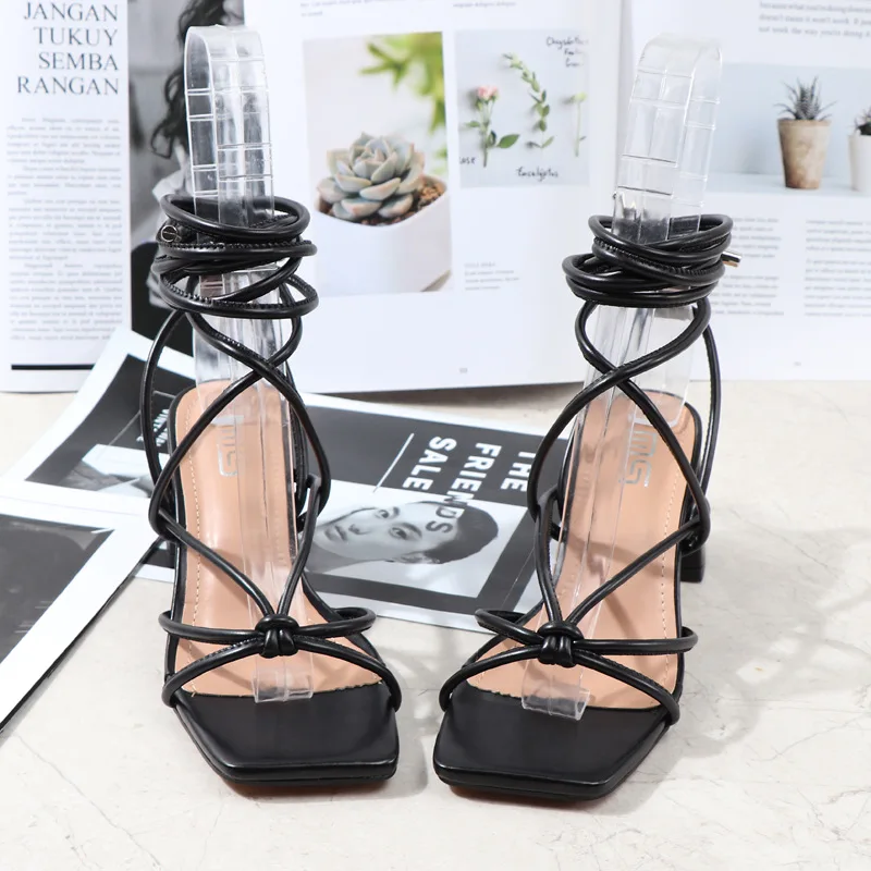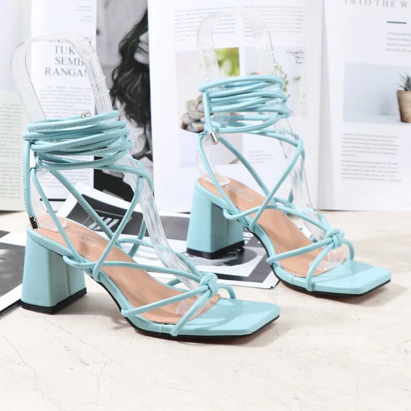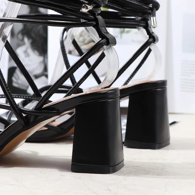Long shoelaces Heel shoes cross strap open toe thick heel square sandals