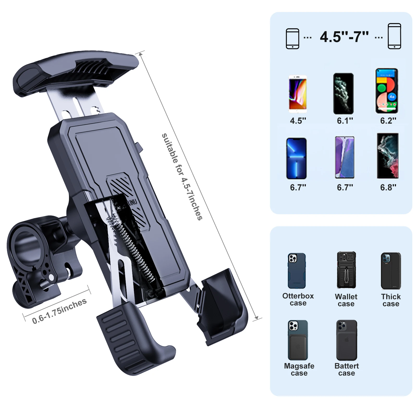 Universal Bike Phone Holder For Bicycle In 4.5 To 7 Inches With Thickness Up To 15mm.The Free Gasket Can Be Used According To The Handlebar Size,No Tools Required For Installation.