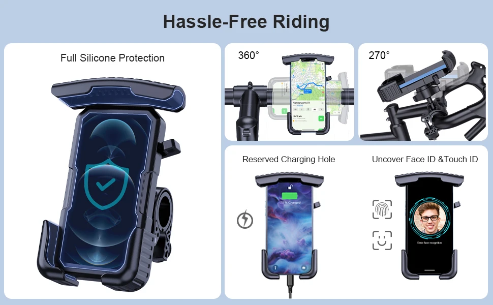 4.Scientific Design: This Bicycle Phone Mount Will Not Prevent You From Unlocking Your Phone, Will Not Block Face Recognition, And The Charging Port Will Not Be Blocked. Full Rubber Protects Your Phone From Scratches.