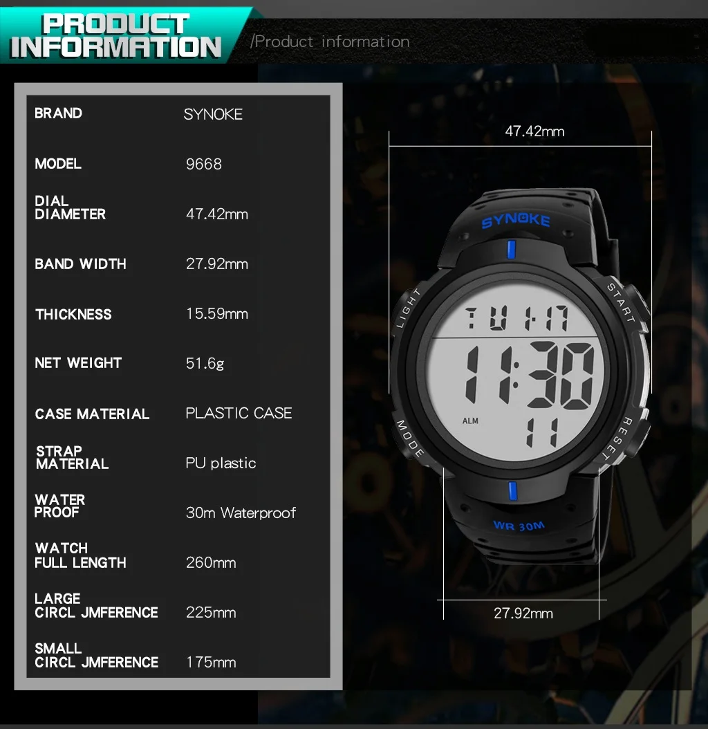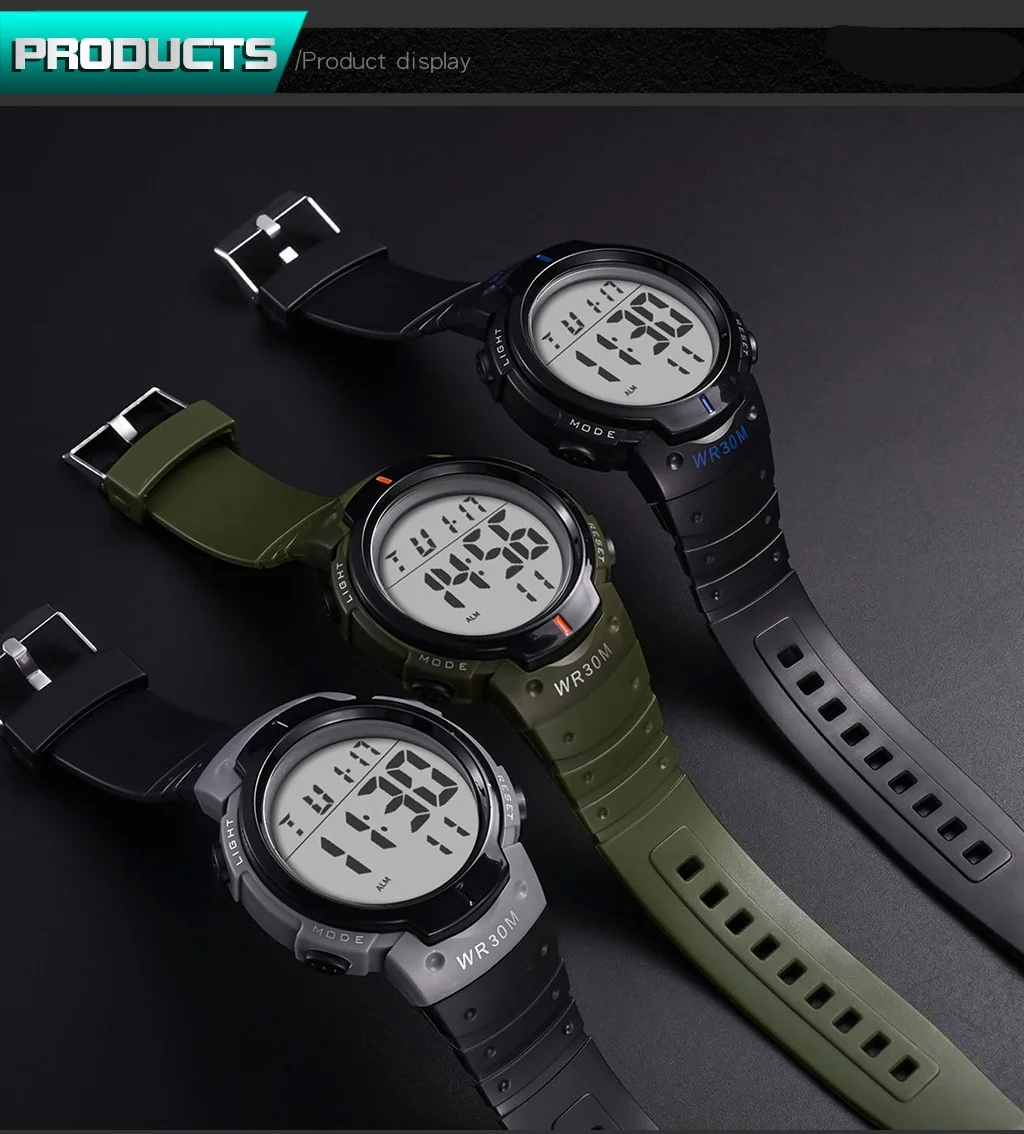 multi-function: display time,stopwatch,back light,Display the date,Display week,Timing alarm clock,12/24 hourly,waterproof,shock resistant,
