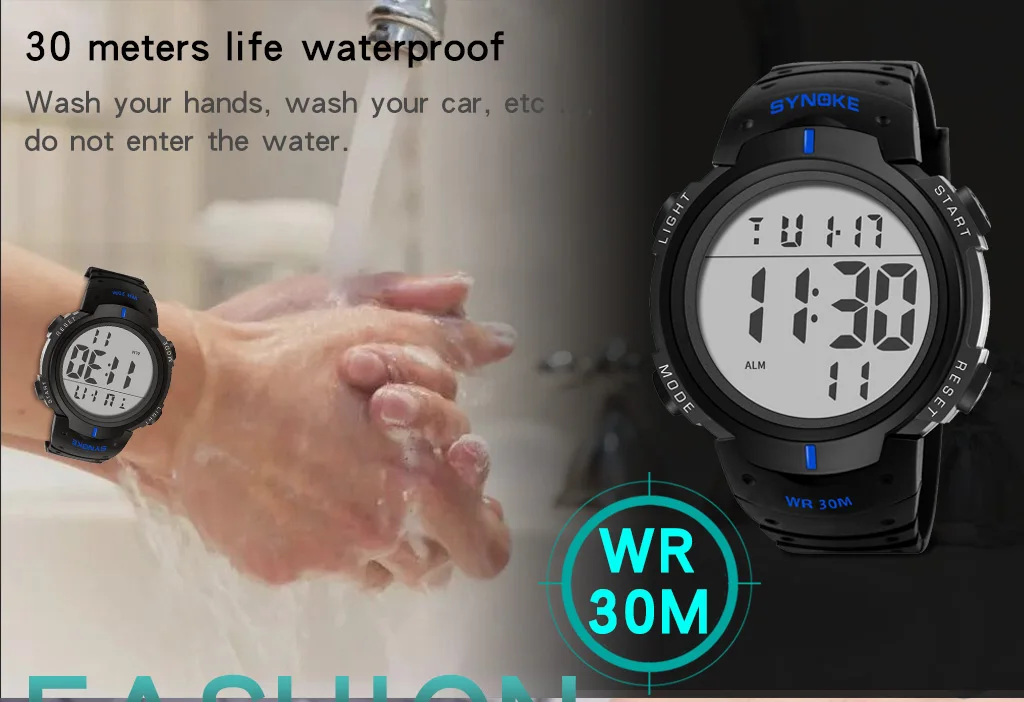 50M deep waterproof: Feel free to wear the watch when you get wet in the rain, take a shower, or wash hands. But please do NOT press any buttons under the water. Also avoid the use in extreme hot or cold temperature