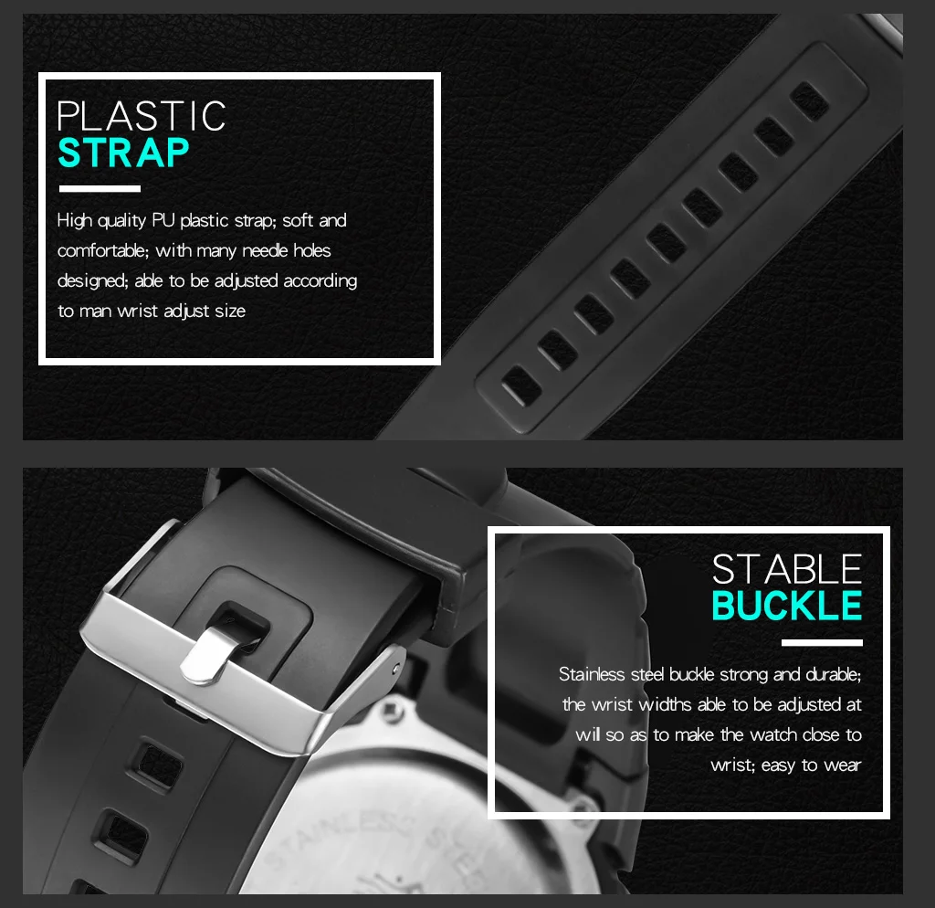 Selection of materials: high quality PU watch band,high quality PC watch case,High transparent resin material mirror surface,Stainless steel bottom cover,stainless steel buckle